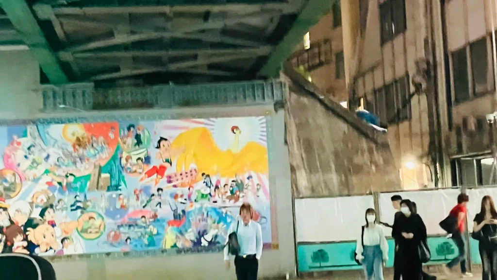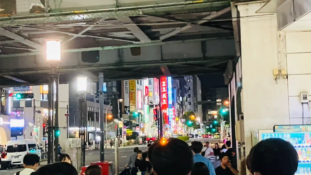 高架下の横断歩道を、向かい側に渡ります。渡ったら右に進みます。