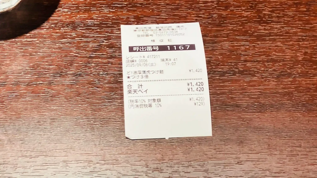 今回は、ど濃厚鷹虎つけ麺の麺量(3倍盛り)540gを注文しました。値段は1,420円です。