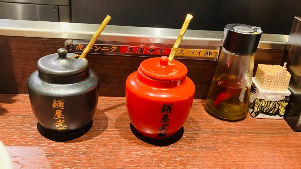 卓上調味料は、お店によって色々ですが高田馬場 麺屋武蔵 鷹虎では、虎ニンニクと唐辛子、お酢が置いてあります。