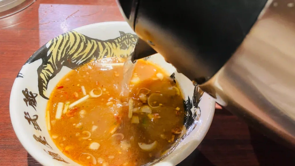 ど濃厚ではなく、おかわりの濃厚スープでしたが割スープをつけ麺スープに入れていきます。